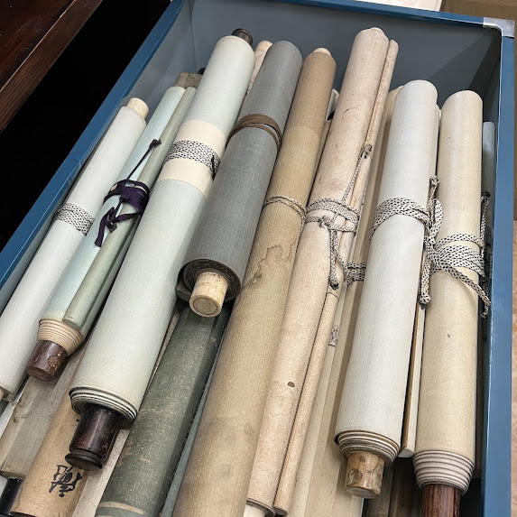 お盆休み明け連日のお買取ありがとうございます。 息つく間も無く沢山の商品が集まっております。 掛軸だけで1000本近く、手が真っ黒になりながらも丁寧に仕分け作業を行っております。 掛軸なら海亀堂にお任せください。